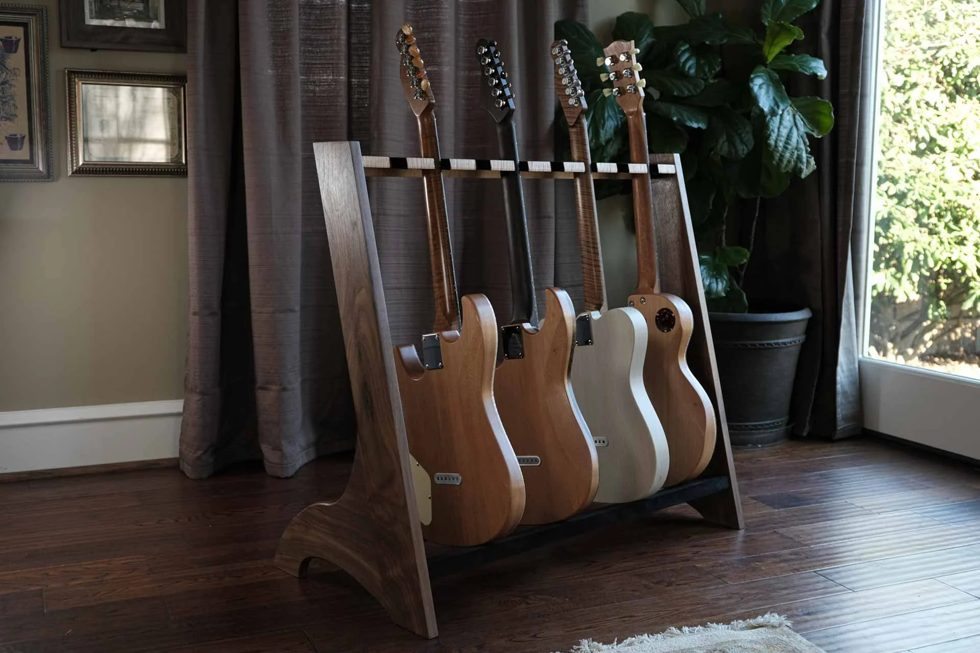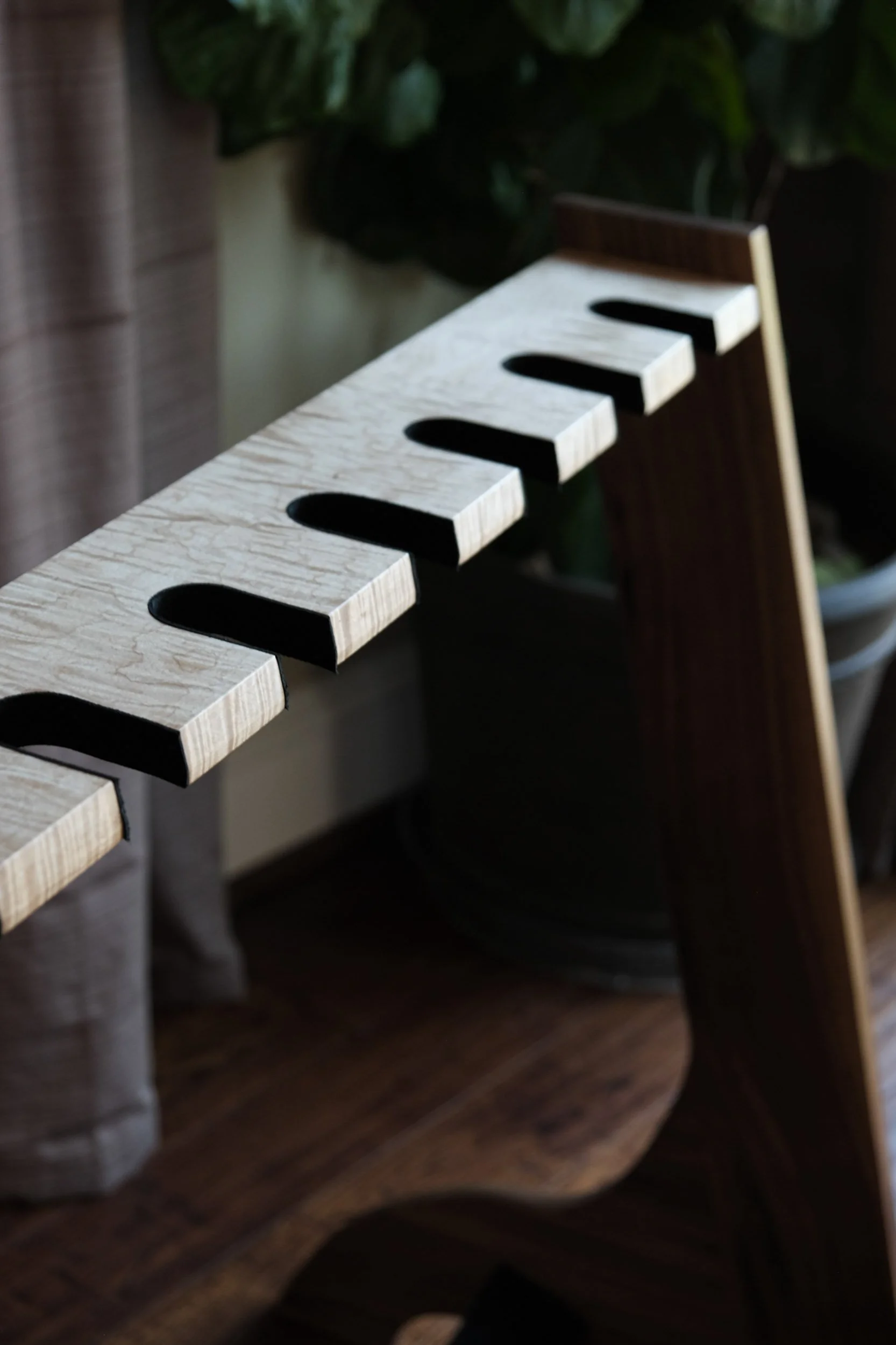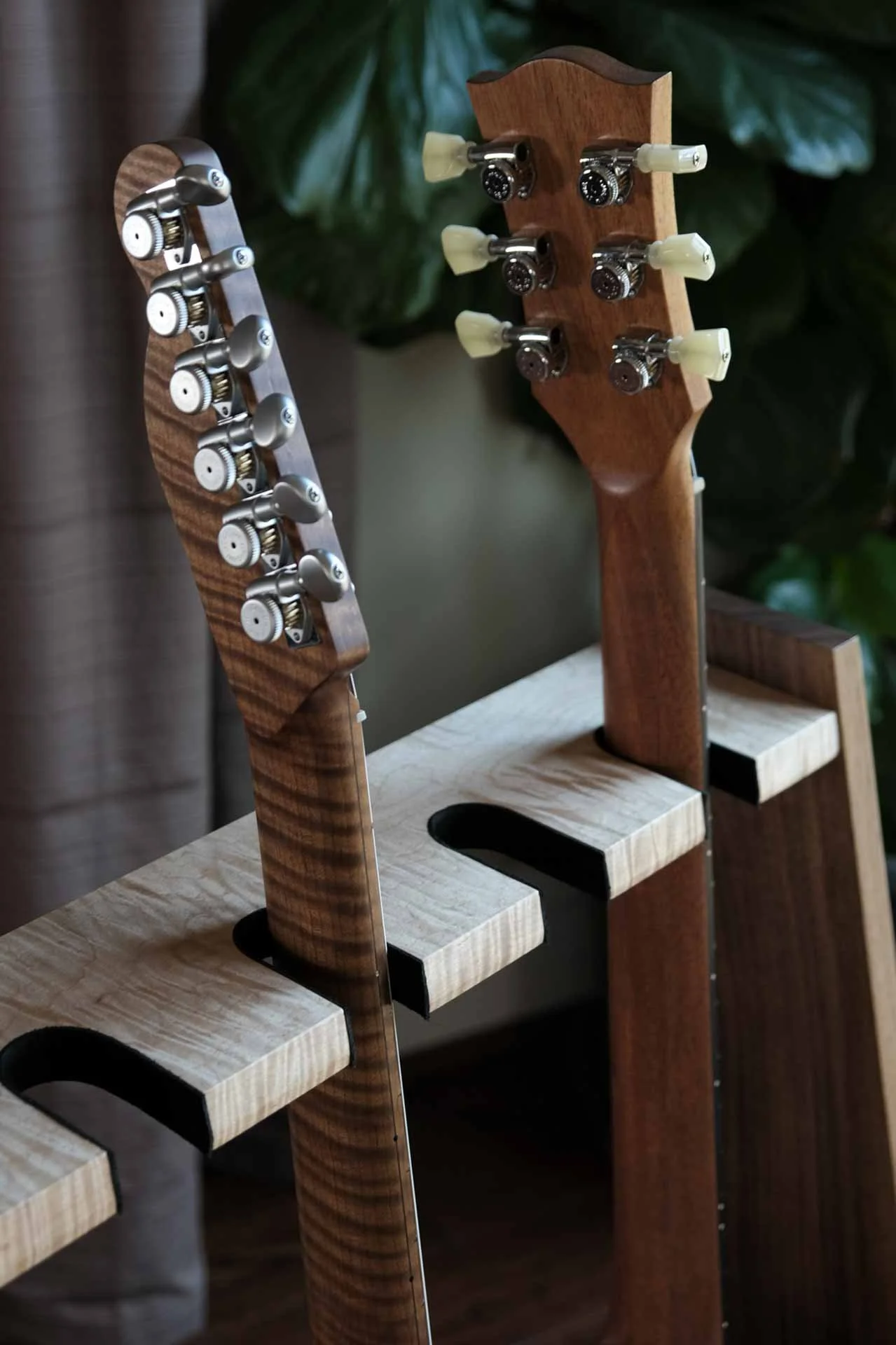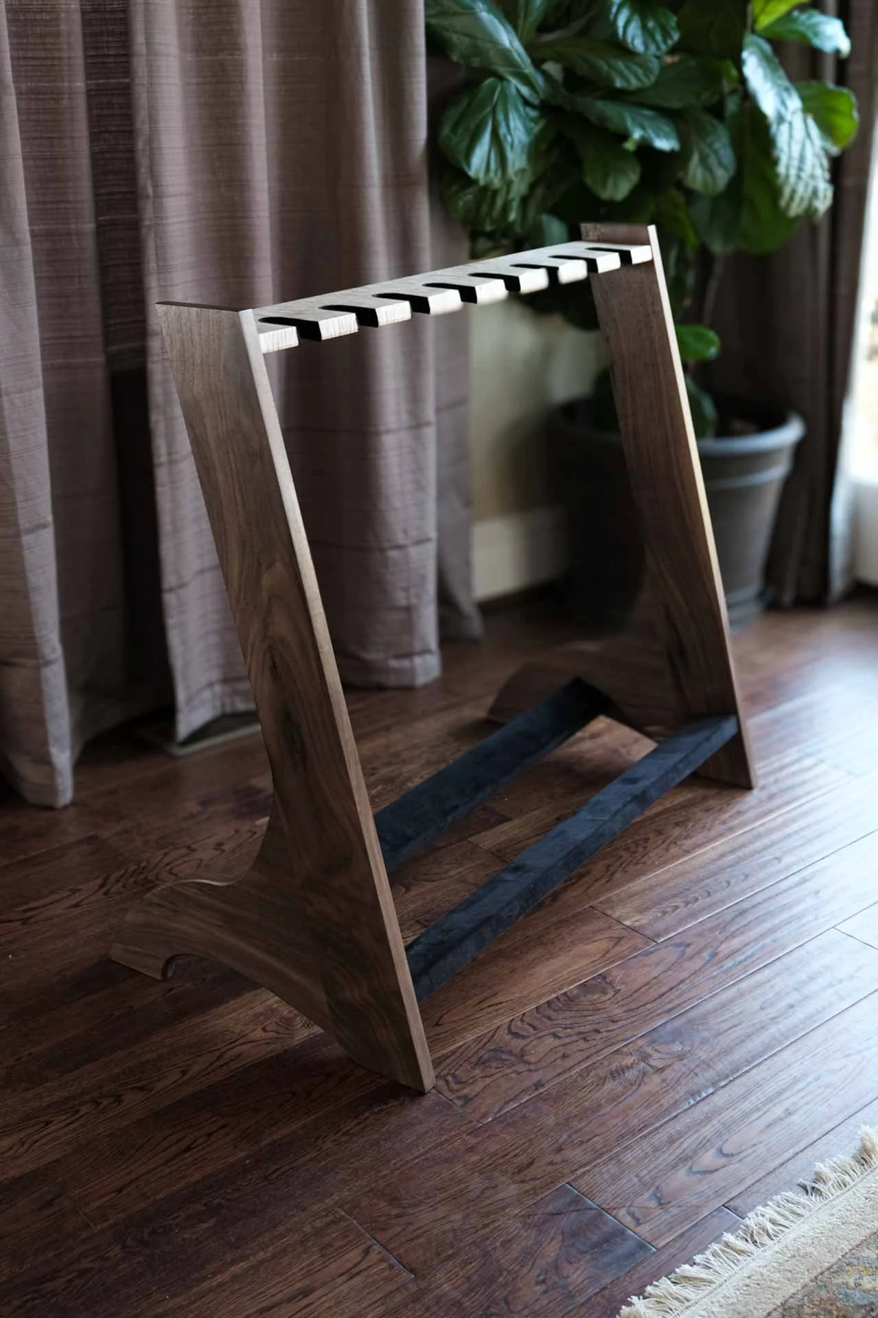 WALNUT + CURLY MAPLE GUITAR RACKMATERIALWalnut + Curly Maple + Black LeatherFINISHNatural Oil + Wax Finish